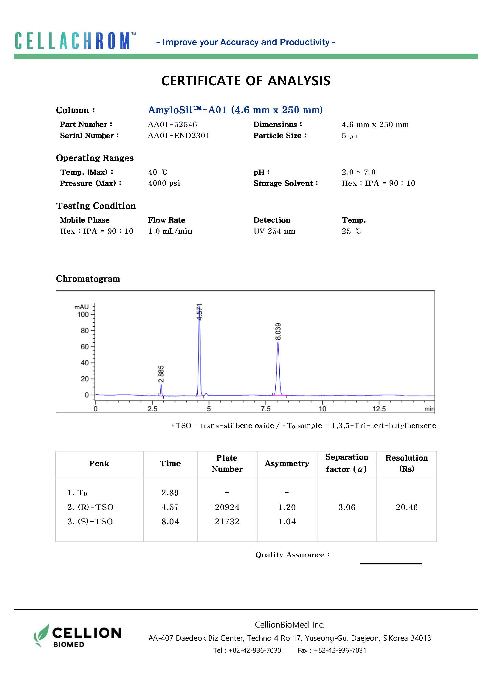 아밀로스 기반의 Carbamate 유도체를 실리카 표면에 코팅한 고정상을 사용하여 키랄 이성질체 간 입체적 상호작용 및 수소결합, π-π 상호작용을 기반으로 분리합니다.