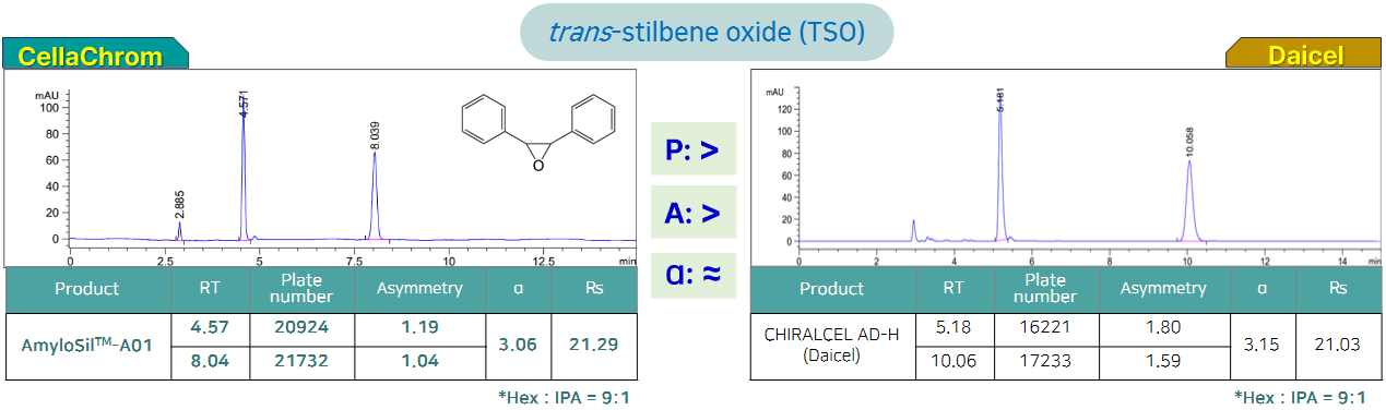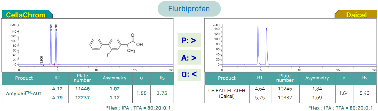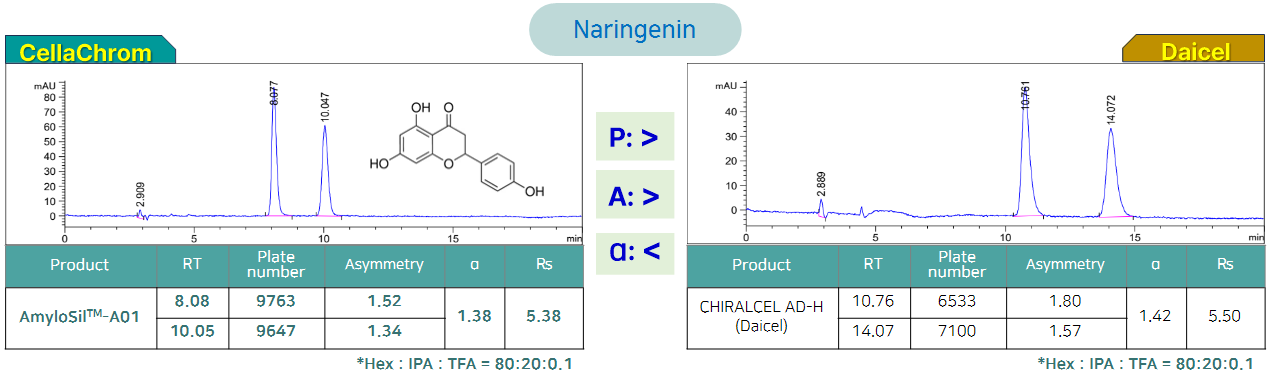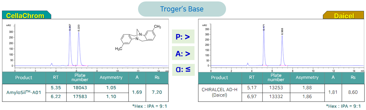 해당 제품은 당사가 개발하여 최적화한 컬럼 제조 기술을 통해 기존 제품들보다 우수한 분리능을 나타냅니다. 같은 작용기를 사용하는 유사 컬럼이 각종 논문 및 특허에서 빈번하게 사용되고 있으며, 당사 컬럼은 그와 유사한 경향의 분리능을 가지고, 높은 구조 인식능력을 가지고 있기 때문에 다양한 키랄 화합물의 분리가 가능합니다.