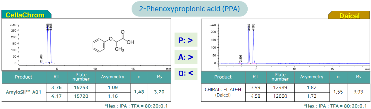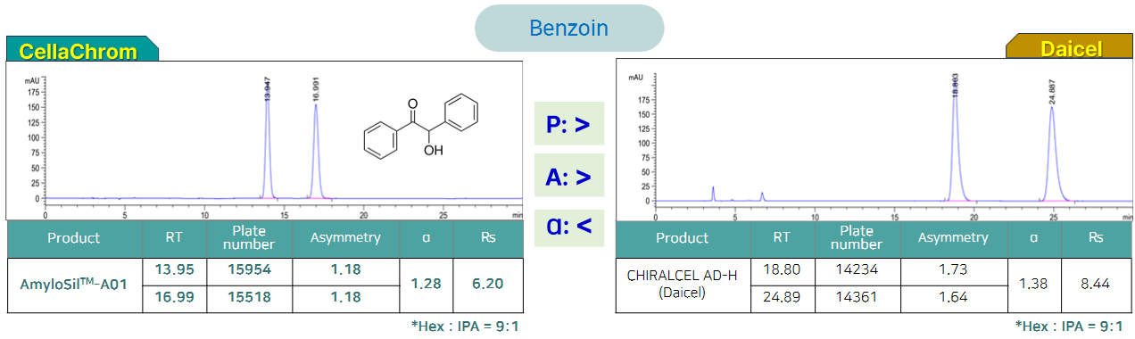 Amylosil-A01은 Cellachrom에서 개발한 아밀로오스 기반의 다당류 키랄 컬럼입니다. 다당류의 하이드록시기를 3,5-dimethylphenyl 작용기로 유도체화한 컬럼은 넓은 영역의 키랄 화합물을 분리하는 데 사용되며, 특히, halide / ether / ester / ketone / sulfoxide / alchohol / amine / acid / amide / aminoalcohol 등의 작용기를 포함하는 라세미화합물 분리에 효율적이며, 500종류의 라세미체의 분리를 시도한 결과 80%의 화합물에 대해서 높은 분리능을 제공하였습니다 (Chemical review 2016, 1094).